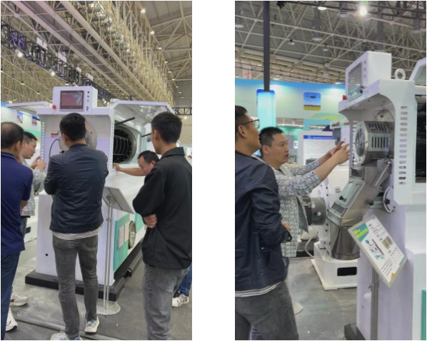華豫萬通此次展出了HRP40智能柔性大米搓光機、YHT700智能大豆脫皮破瓣機、HTY智能葵花籽脫殼機、冰冷式纖維微粉機等創(chuàng)新產(chǎn)品亮相展會,并圍繞糧機創(chuàng)新技術(shù)和數(shù)智化工程等新質(zhì)生產(chǎn)力與看展客商探討交流,以技術(shù)實力促進糧食加工企業(yè)轉(zhuǎn)型升級。