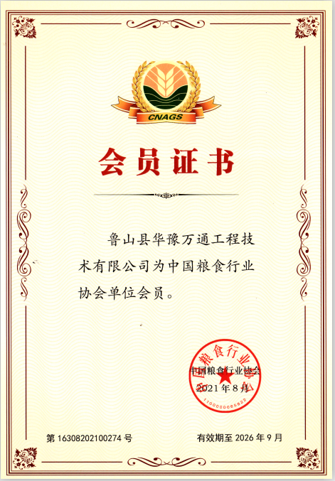 2021年8月,中國糧食行業(yè)協(xié)會經(jīng)多方位考察,授予魯山縣華豫萬通工程技術有限公司評會員單位稱號,并頒發(fā)會員單位證書。