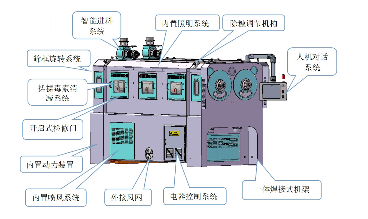 2、差速逆向金剛石搓板搓揉結構:物料經(jīng)機械推動,高密度揉搓室及負壓的作用下,使附著在物料表面的真菌毒素分離并排出機外。